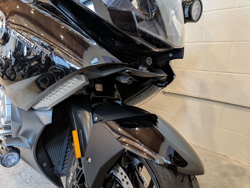 Beautifully kept K1600GT - well equipped with touring windscreen, Clearwater Erica driving lights, auxiliary GPS/electronics mounts, saddle bag guards, and more. Plus, much of the bike is protected with clear Paint Protection Film to keep that black storm metallic paint looking its best!