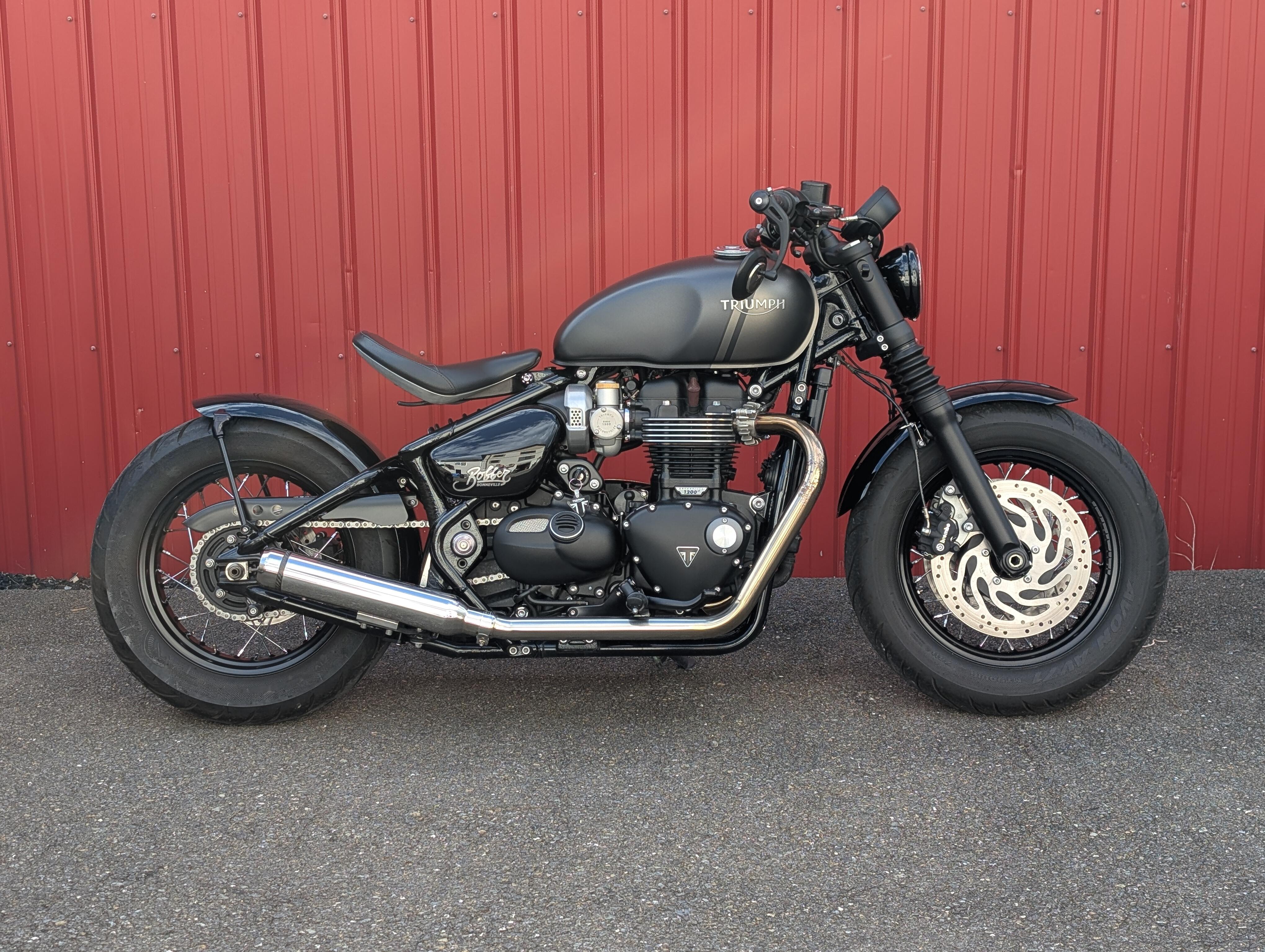 Check out this Bobber - sold and serviced here at Hermy's! All cleaned up with aftermarket fender and slick LED lighting, plus the right exhaust to let you hear that big Triumph twin the way it should be!